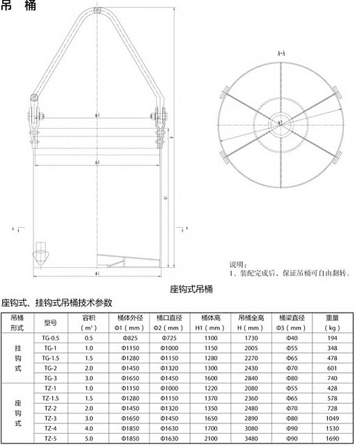 吊桶是立井井筒開鑿期間提升矸石、升降人員和材料的主要容器。當(dāng)井筒涌水量小于6m3/h時(shí),還可作排水用,根據(jù)卸矸形式不同吊桶分為掛鉤式吊座鉤式吊桶。