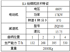 K4給煤機技術(shù)特征 電動機 電壓 660V 功率 17KW 轉(zhuǎn)速(轉(zhuǎn)/分) 970 減速機 型號 ZQ500 速比 15.75 曲柄位置 1 2 3 4 生產(chǎn)能力T/h 132 268 395 530 重量 2880Kg 保證每一臺給煤機正常連續(xù)工作,才能確保 原煤的暢通運輸,否則每一臺給煤機的故障,都不同程度的影響生產(chǎn)產(chǎn)量。