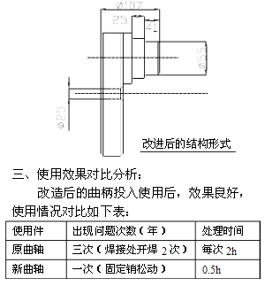 由以上對比可以明顯看出,改進后事故率明顯降低,沒有出現(xiàn)焊接件開焊問題,僅出現(xiàn)固定銷松動一次,處理時間只用了半小時。新、舊曲軸對比改進后可以增加效益(按較小煤量200噸/h、有50%的處理時間在生產(chǎn)班計算):3.5×50%×200×400=140000元,再減去增加的制造費用3500元(雖然曲柄的重量小,但是由于改進后的新曲軸加工工藝較為復(fù)雜,制造價格有所增加),每年可為礦增加的效益還是十分明顯。
