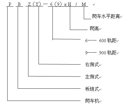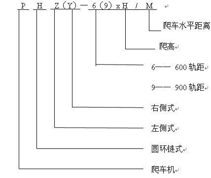 液壓鏈?zhǔn)脚儡嚈C(jī)用于600軌距1t、1.5t及900軌距1.5t、3t礦車向上爬高,根據(jù)爬高不同共有14種型號(hào),每種又根據(jù)傳動(dòng)裝置布置方式不同分為左側(cè)式與右側(cè)式。