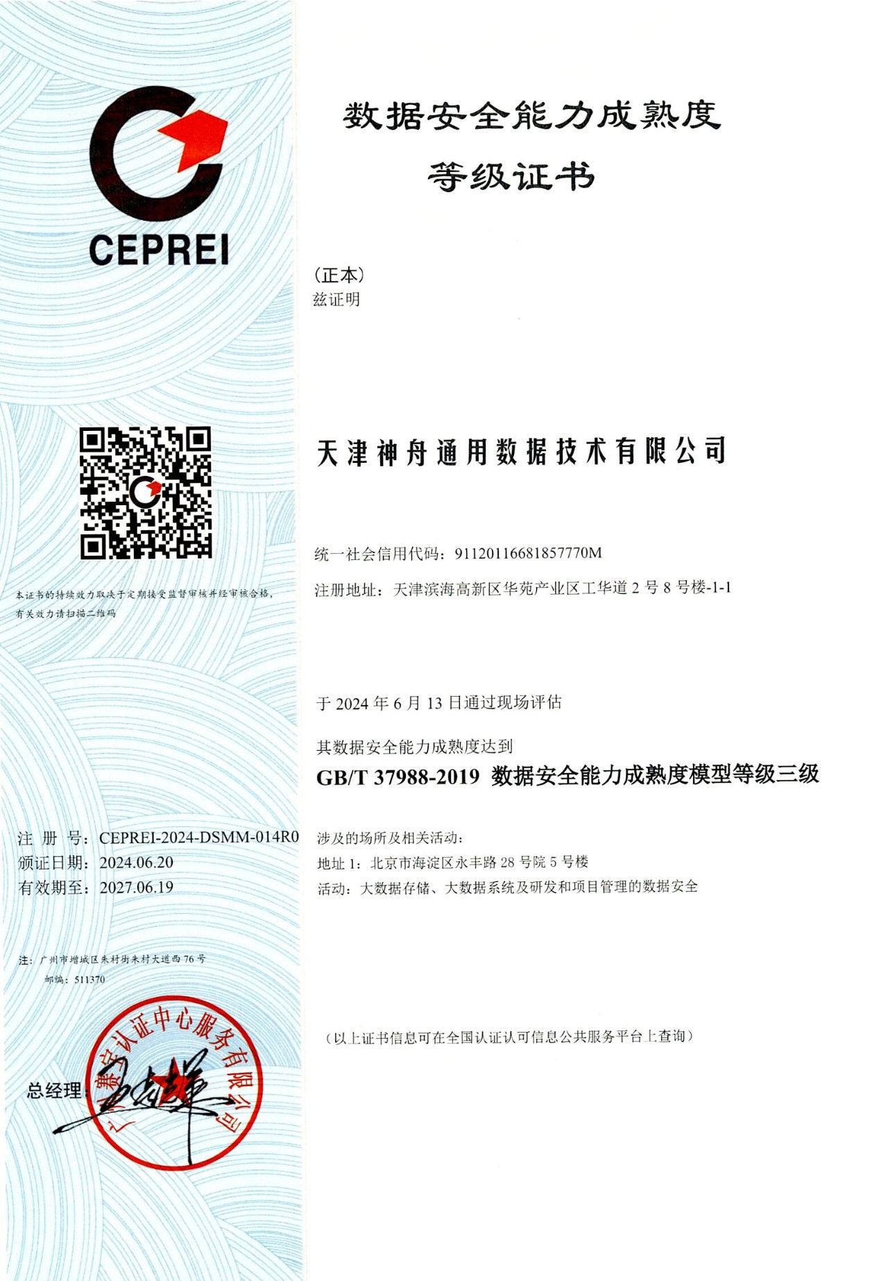近日,神軟公司下屬天津神舟通用數據技術有限公司(以下簡稱:神通公司)正式獲頒DSMM數據安全能力成熟度三級認證證書,標志著神通公司數據安全管理能力邁上新臺階。